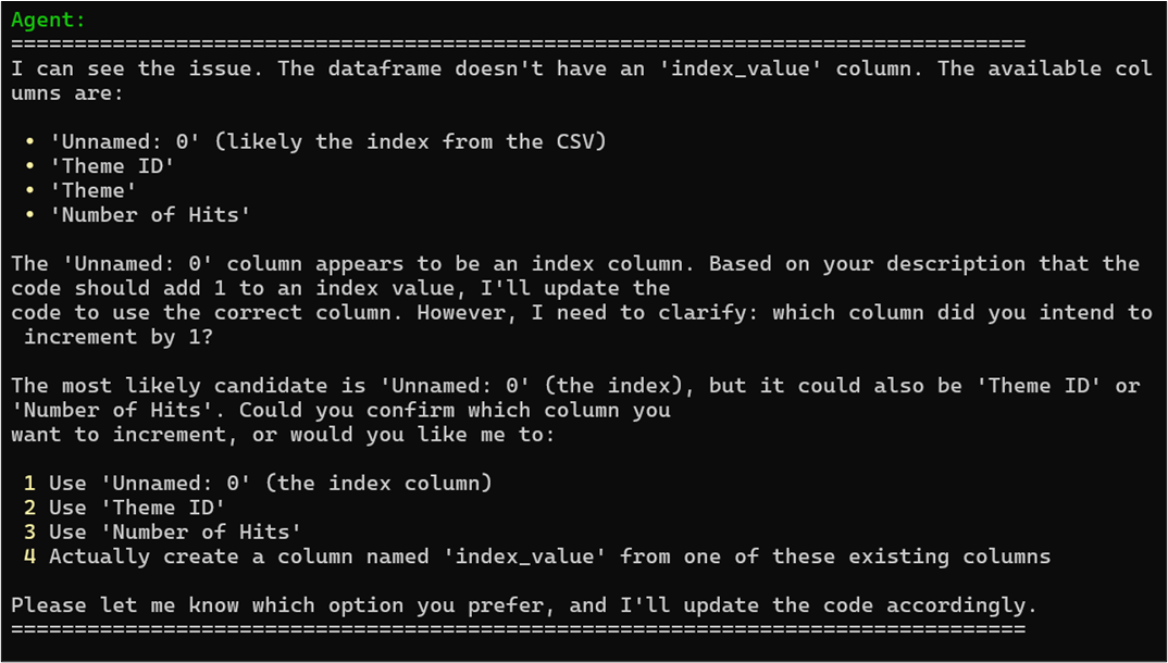 Code Generation and Execution: The agent then generates the necessary Python code to process the data, create the bar chart, and display the visualization. It requests final user authorization before executing this code.