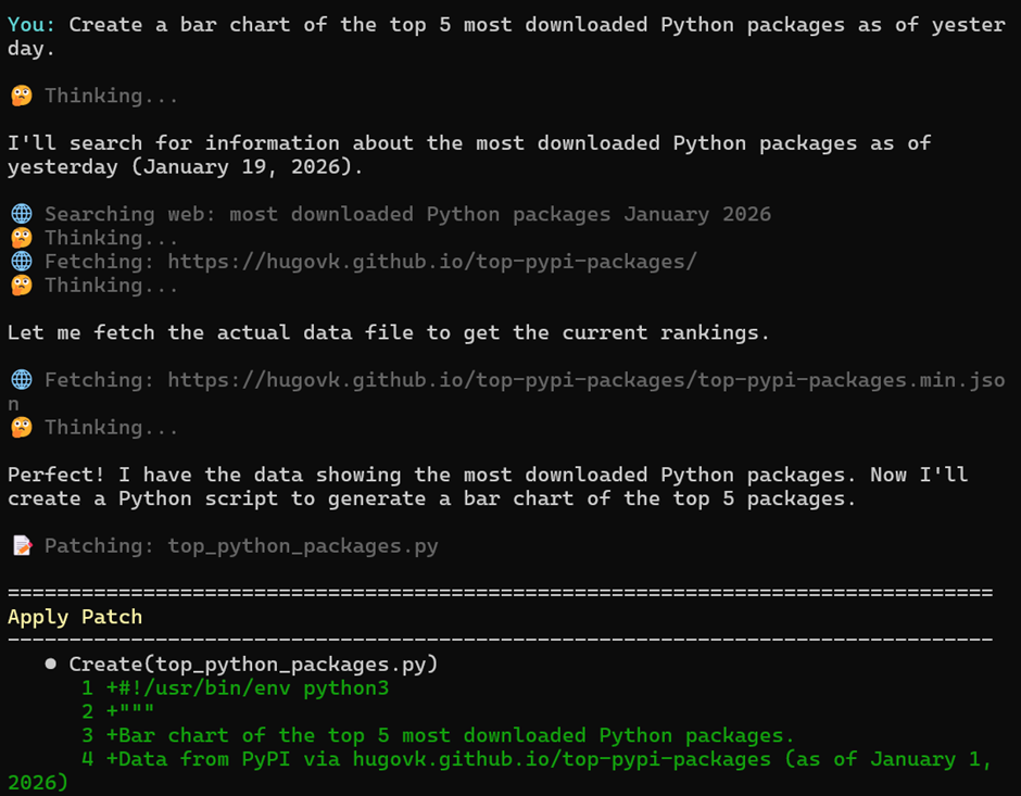 When generating a bar chart of the top 5 downloaded Python packages, the agent will follow a transparent, permission-based workflow by default: